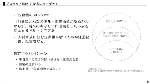 今市 今回のスライドは、メディアのターゲットを示した図です。スライドの左側で具体的なペルソナと利用シーンを、右側で想定される人数規模とその根拠を示してます。