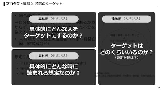 池照 さて、じゃあまずはスライド全体のレイアウトを考えてみよう。さっき今市くんが言ってくれた通り、このスライドは左側で「ターゲットや利用シーンの具体的なイメージ」、右側で「ターゲットが全体でどのくらいいるのか」を説明してるよね。